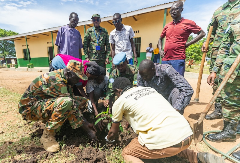 Today, Rwanda Defence Force peacekeepers participated in renovating and painting classrooms in Kapuri Primary School. They also donated educational materials, planted fruit trees and cleared bushes and shrubs during the periodic community service that involved parents, students and local community.